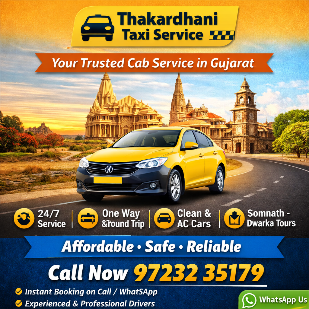 🚖 Thakardhani Taxi Service – Your trusted cab partner in Gujarat. We provide reliable, affordable, and comfortable taxi services across Somnath, Dwarka, Jamnagar, and Rajkot. Whether you need a local ride, outstation travel, or a temple tour, we are available 24/7 to serve you.