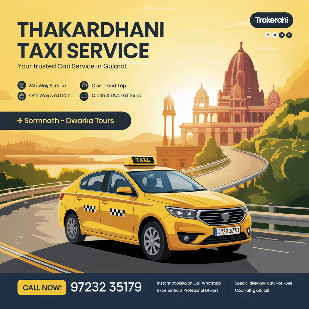 Book reliable cab services in Somnath, Dwarka, Jamnagar, and Rajkot with Thakardhani Taxi Service. We provide safe, comfortable, and affordable taxi solutions for local travel, outstation trips, and temple tours. 📞 Call Now: 97232 35179